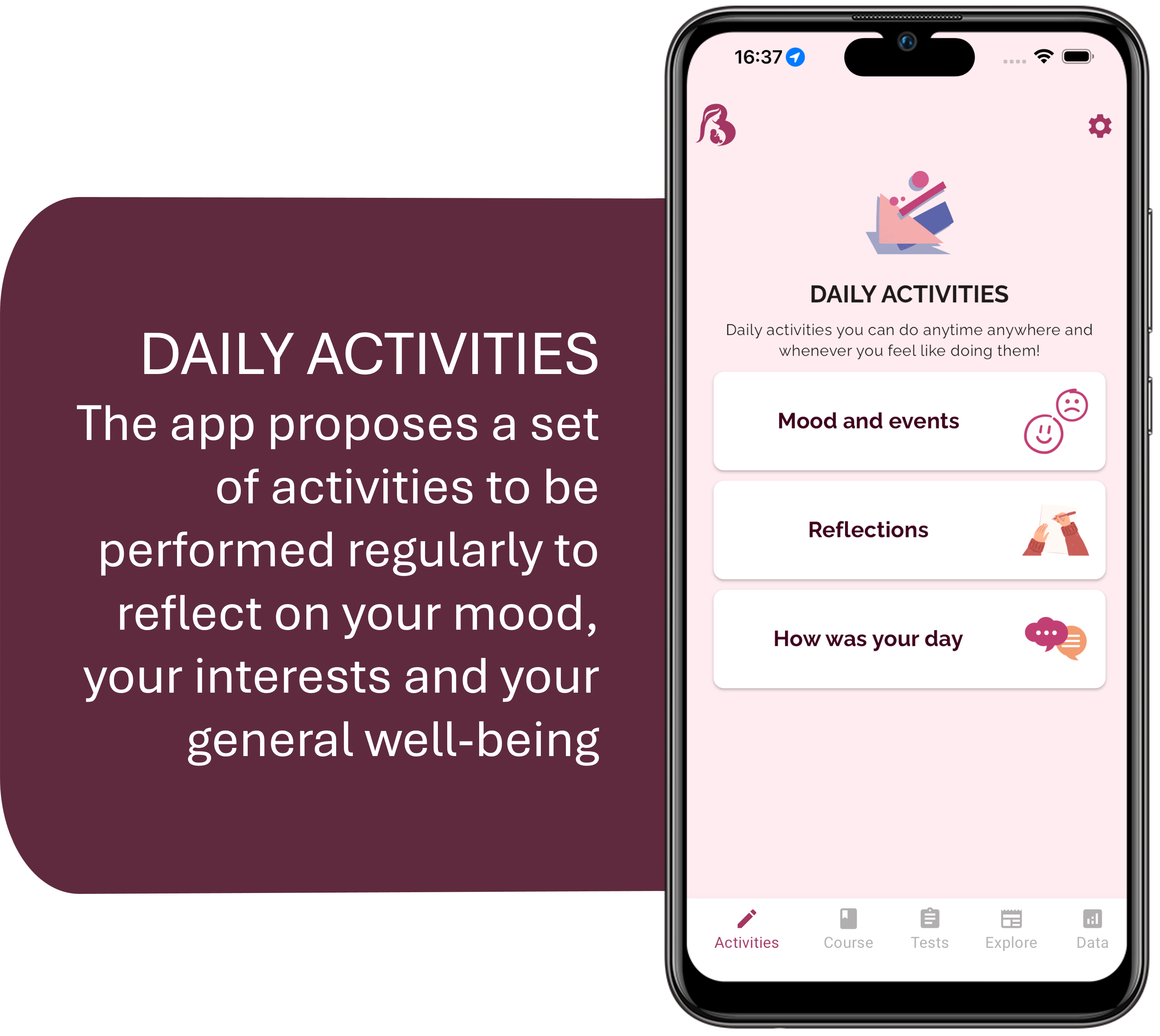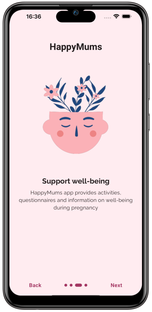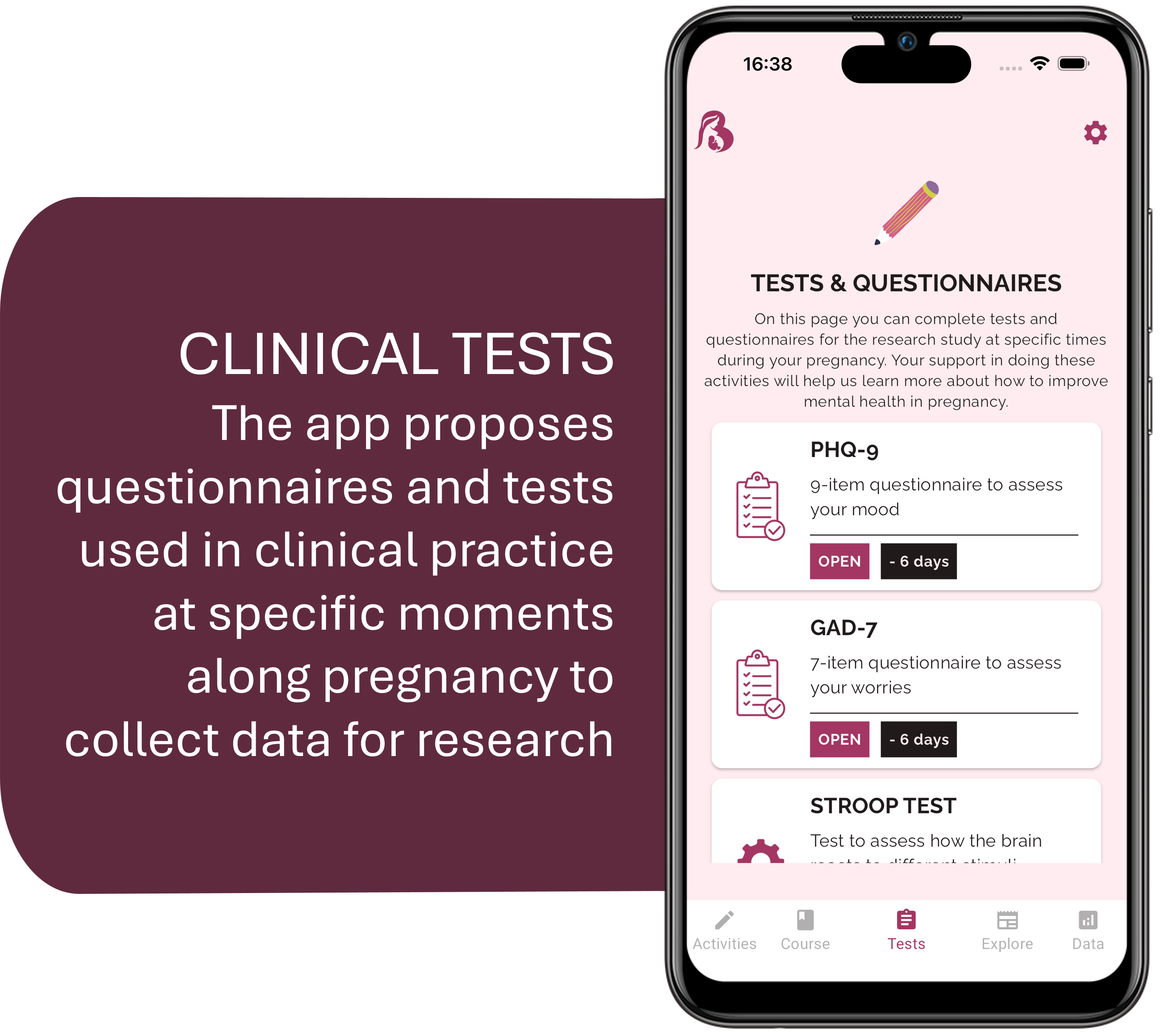 Users can engage with questionnaires and tests used in clinical practice that will be made available in the app at specific moments along pregnancy and that will be monitored by clinical researchers of the HappyMums project.