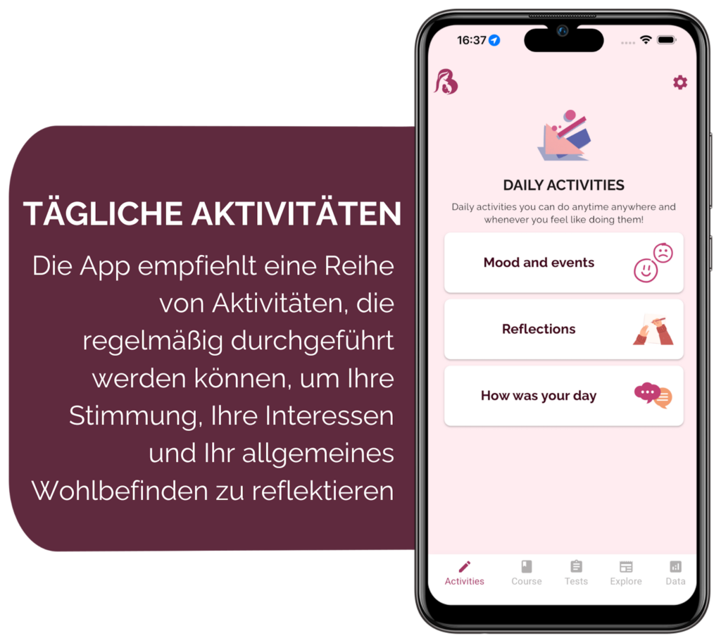 Durch In-App-Aktivitäten, die Funktionen wie Sprach-/Videoaufzeichnung, Texteingabe und spontane Dateneingabe implementieren, zielt die App darauf ab, die Nutzerinteraktionen zu analysieren, um wertvolle Parameter für das psychische Wohlbefinden zu ermitteln.
