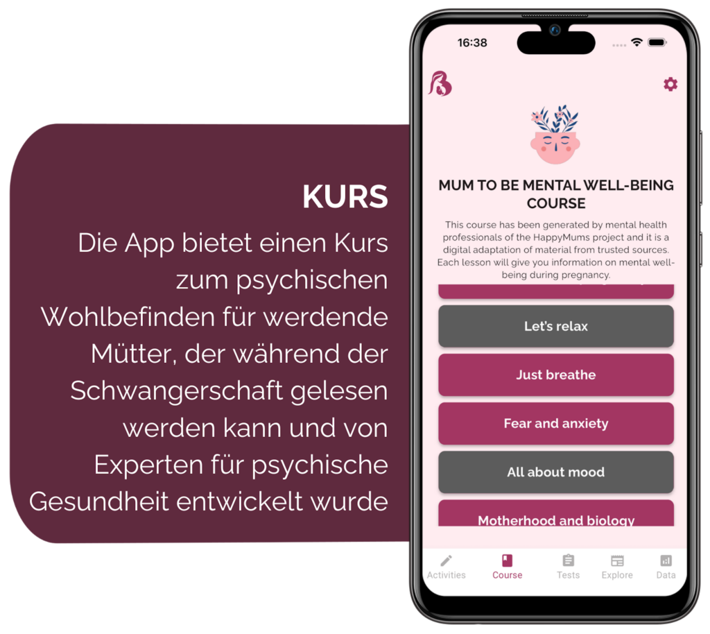 Die App bietet auch einen Kurs mit Informationen über das psychische Wohlbefinden während der Schwangerschaft. Der Kurs ist eine digitale Adaption von Material aus bewährten Quellen und wurde von Experten und Expertinnen für psychische Gesundheit entwickelt.