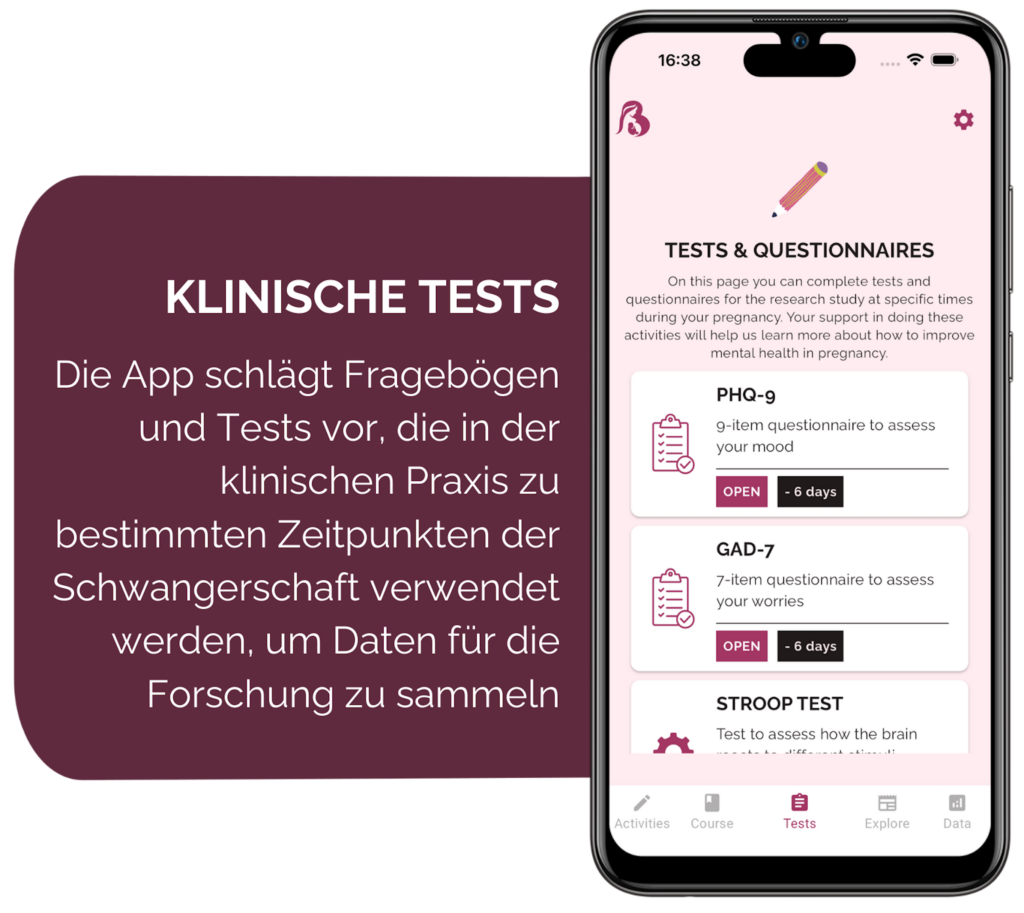 Die Nutzerinnen können sich mit Fragebögen und Tests aus der klinischen Praxis beschäftigen, die zu bestimmten Zeitpunkten der Schwangerschaft in der App zur Verfügung stehen und von den klinischen Forschenden des HappyMums-Projekts betreut werden.