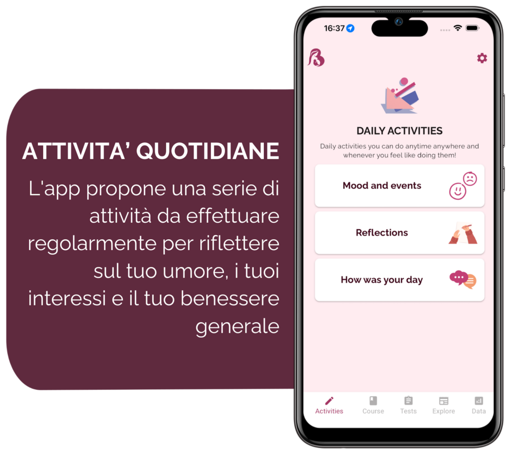 Attraverso alcune attività presenti nell’app che applicano funzioni come, ad esempio, la registrazione della voce/video, l’immissione di testo e lo spontaneo inserimento di informazioni, l’app si propone di analizzare le interazioni dell’utente per estrarre parametri utili associati alla salute mentale.