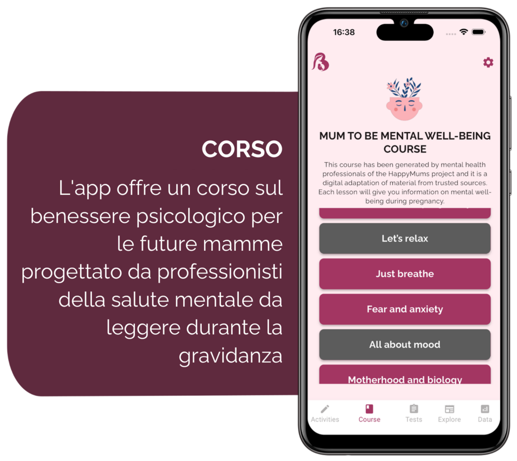 L’app fornisce anche un corso sulla salute mentale durante la gravidanza. Il corso rappresenta un adattamento in formato digitale di materiale da fonti autorevoli ed è stato sviluppato da professionisti della salute mentale.